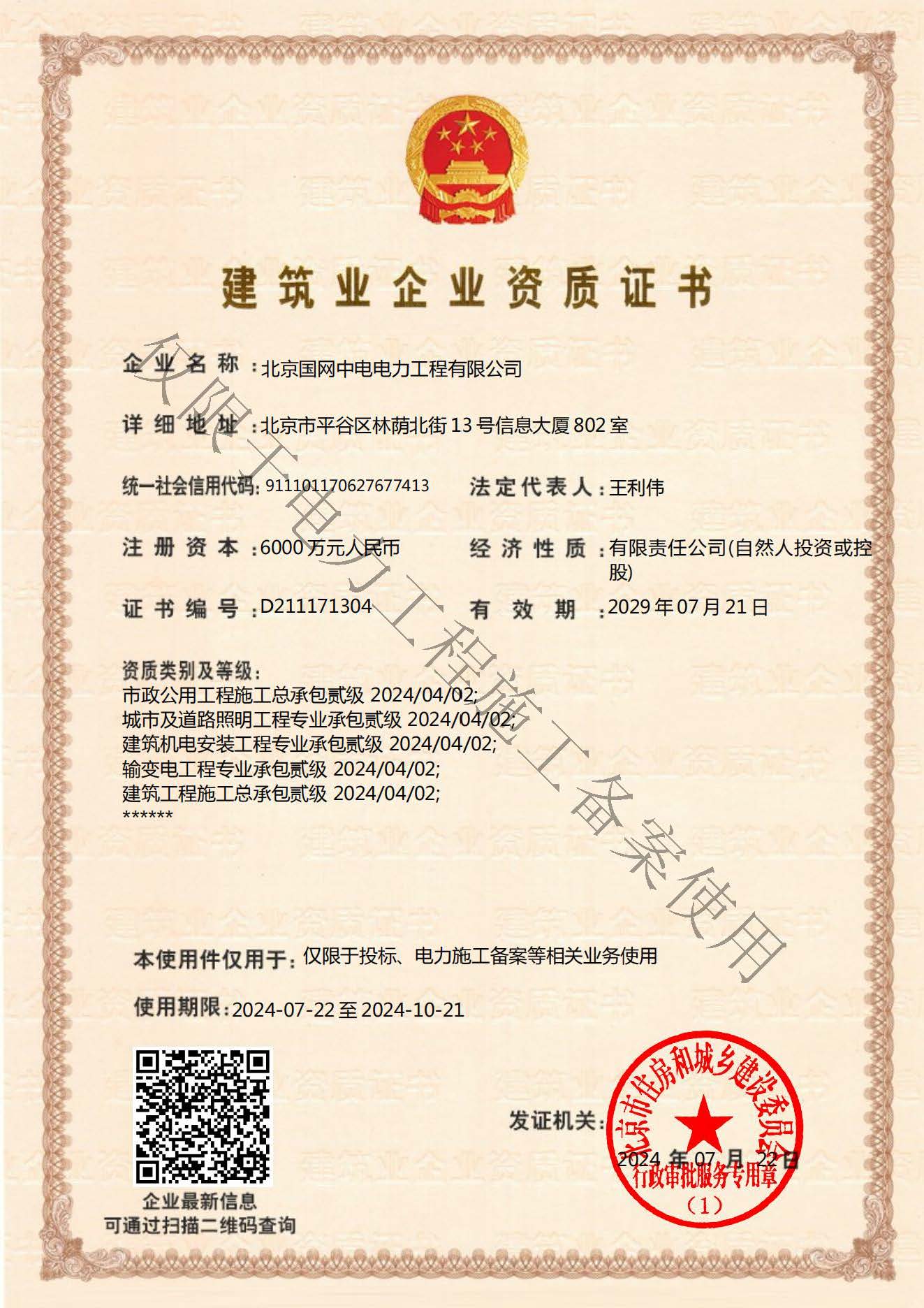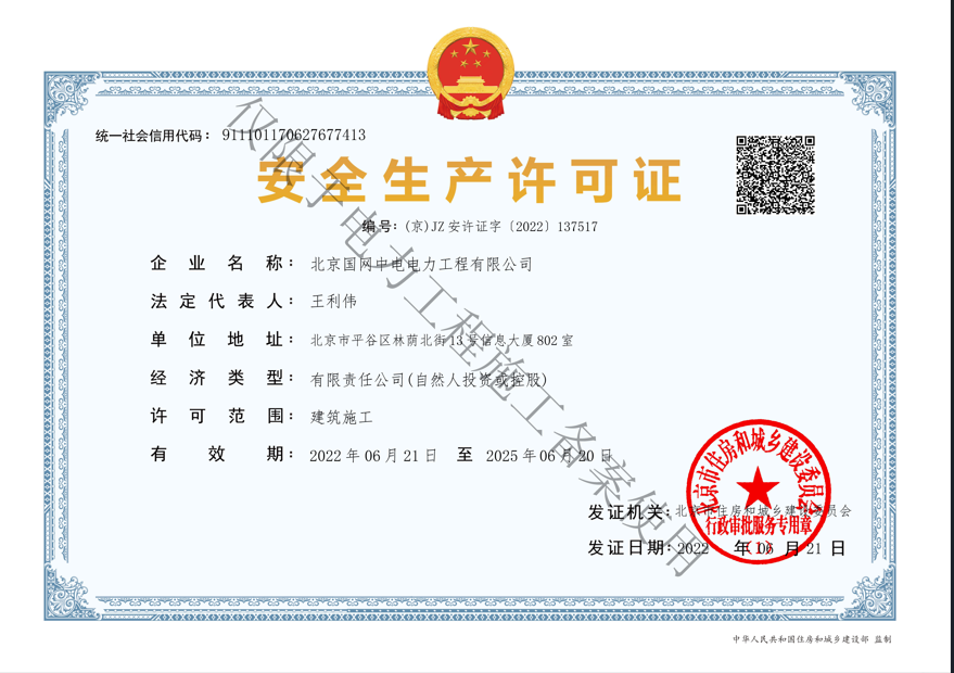 北京國網中電電力工程有限公司,已取得國家電監會頒發的《承裝(修、試)電力設施許可證》、為電力施工承裝四級、承修四級、承試四級企業。北京市住房和城鄉建設委員會頒發的房屋建筑施工總承包二級、機電設備安裝工程專業承包二級、輸變電專業承包二級、城市及道路照明工程專業承包二級、市政公用工程總承包二級資質、勞務不分等級,已通過ISO9001:2015 GB/T50430-2017質量管理體系、GB/T24001-2016/ISO 14001:2015環境管理體系、